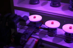 The plant's age was determined by an RGB light downlighting it, with blue indicating the plant is too young, green indicating it is just right, and red indicating it is too old.